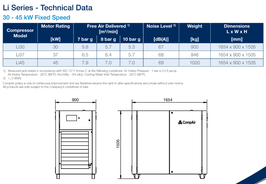 Industries across the globe rely on CompAir rotary screw compressors for the supply of high quality compressed air. The CompAir Li series air compressor range incorporates the best of CompAir technology, design and quality. To deliver reliable, economical and efficient performance in a completely new package. The Li series delivers high quality air at volumes at a pressure range between 7 and 10 bar and is available in air cooled versions.